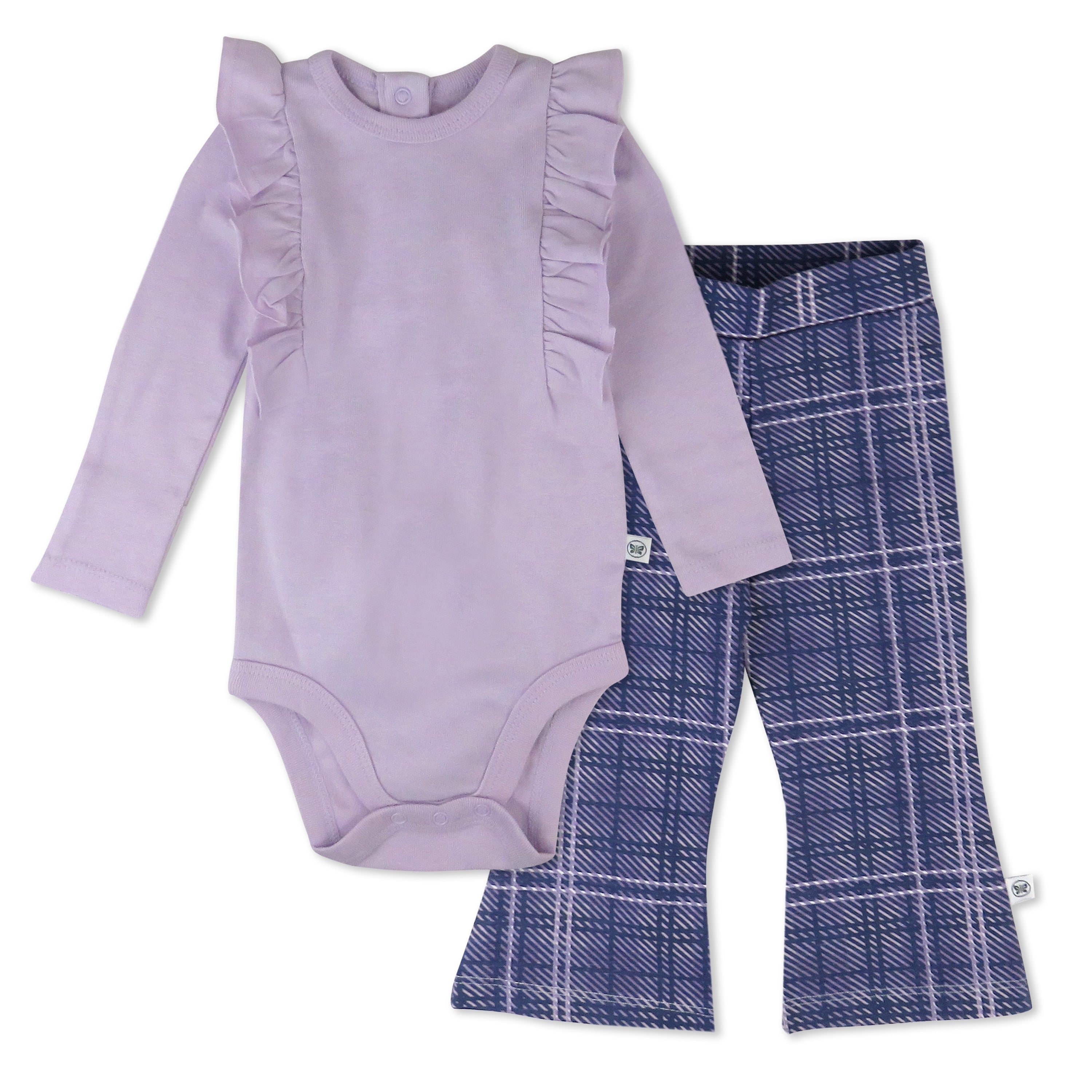 This new 2-piece set including a long sleeve ruffle bodysuit with flare leggings is the cutest look for Fall. This outfit is comfy and cozy for baby and easy for parents. Responsibly made from machine washable certified organic cotton, this bodysuit features nickel free snaps on the back and the bottom for easy dressing and quick changes. Ruffles around the shoulders make this the perfect top for little girls. Pair this top with our pull-on leggings with a stylish flare leg opening. Available in adorable prints and colors, you'll want more than one set. Makes a great baby gift too!