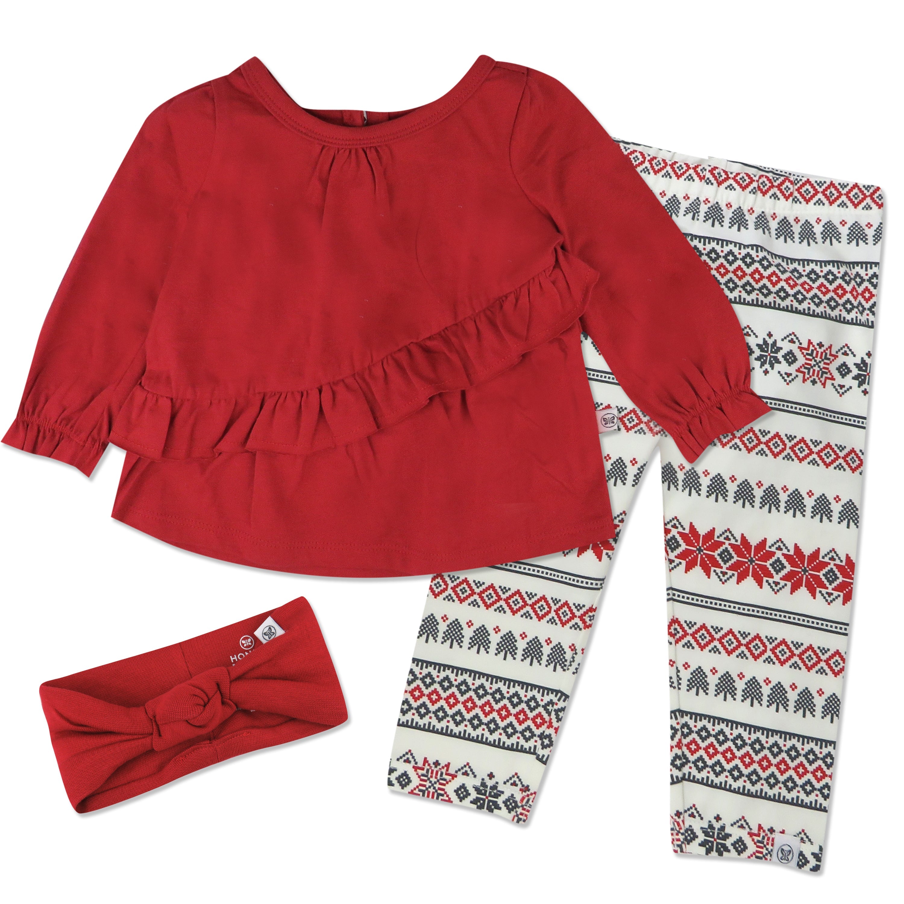 For a head-to-toe holiday look, your little girl will be picture-perfect in this 3-piece set made from organic cotton. Our tunic style top has ruffle details and dressing is a breeze with our comfy pull-on leggings. Top off this look with an adorable knotted headband. Makes a great holiday gift!