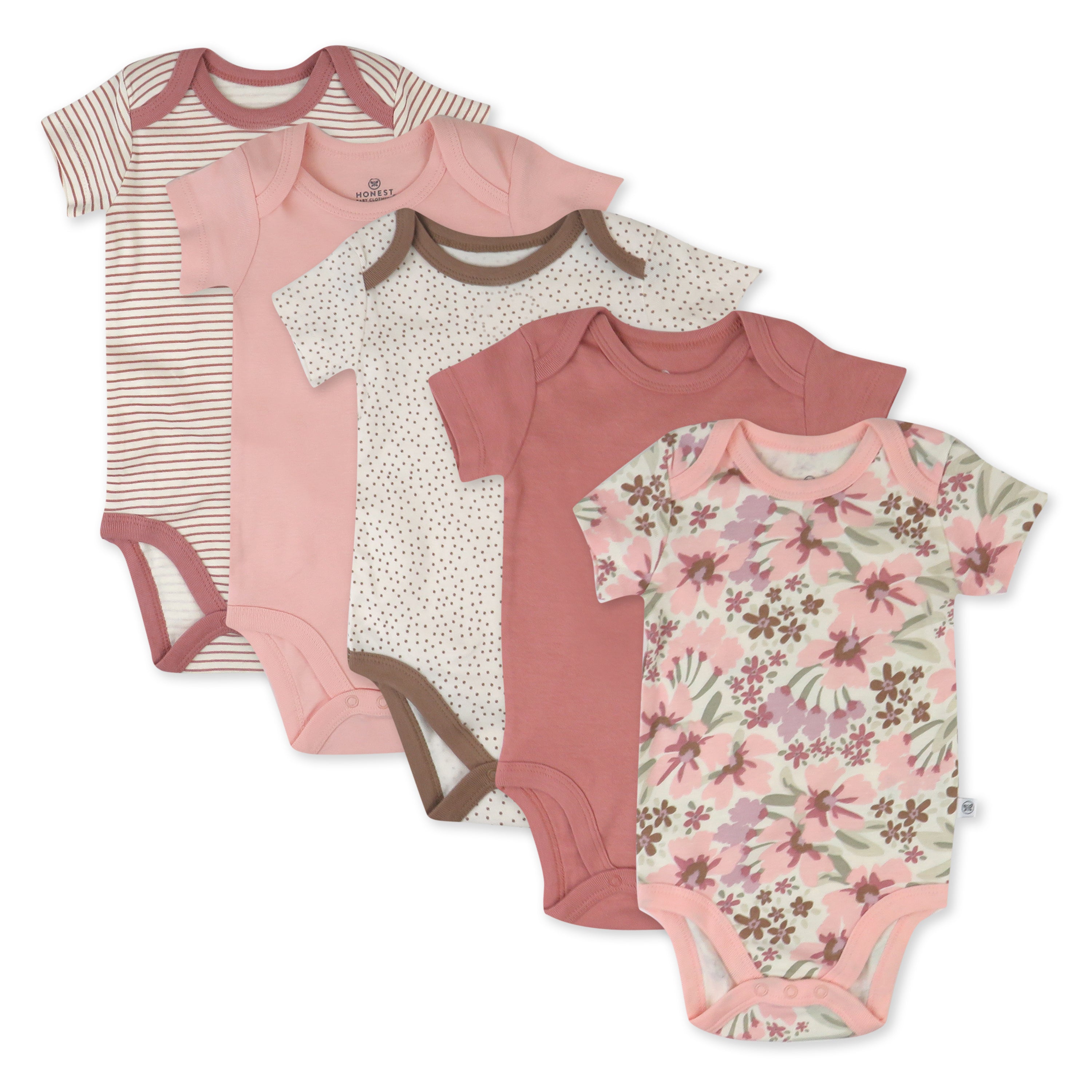 Bodysuits are must-have essentials for babies. This 5-pack of bodysuits keeps baby comfy and cozy all day long. An envelope neck that expands and nickel-free snaps at the bottom make dressing easier and changes quick. Made from 100% certified organic cotton, this short-sleeve bodysuit is just right to wear on its own or layered for super-cute styles.