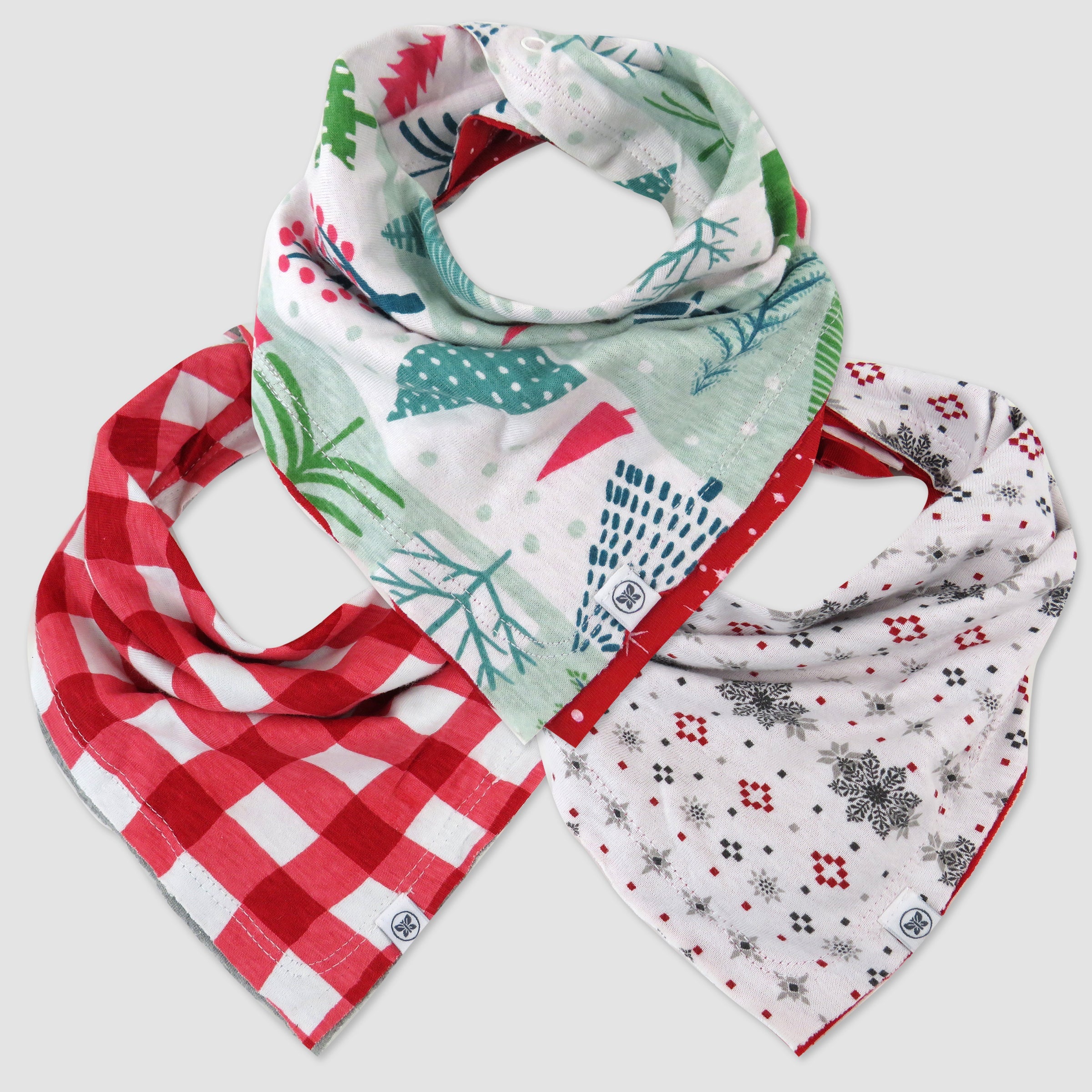 These reversible bandana bibs are perfect for babies when things get a little messy. Keep your baby clean and dry with these 2-in-1 bandana bibs made of 100% organic cotton. Each bib is reversible and paired with a fun color or print so you get two cute looks in one bib. This convenient style can be used as a burp cloth when flat and it converts to a bib with adjustable snaps at the corners. Not just for feeding, these bibs are great for droolers and make a cute accessory for any outfit. Registry must-have - makes a great baby shower or Holiday gift too!