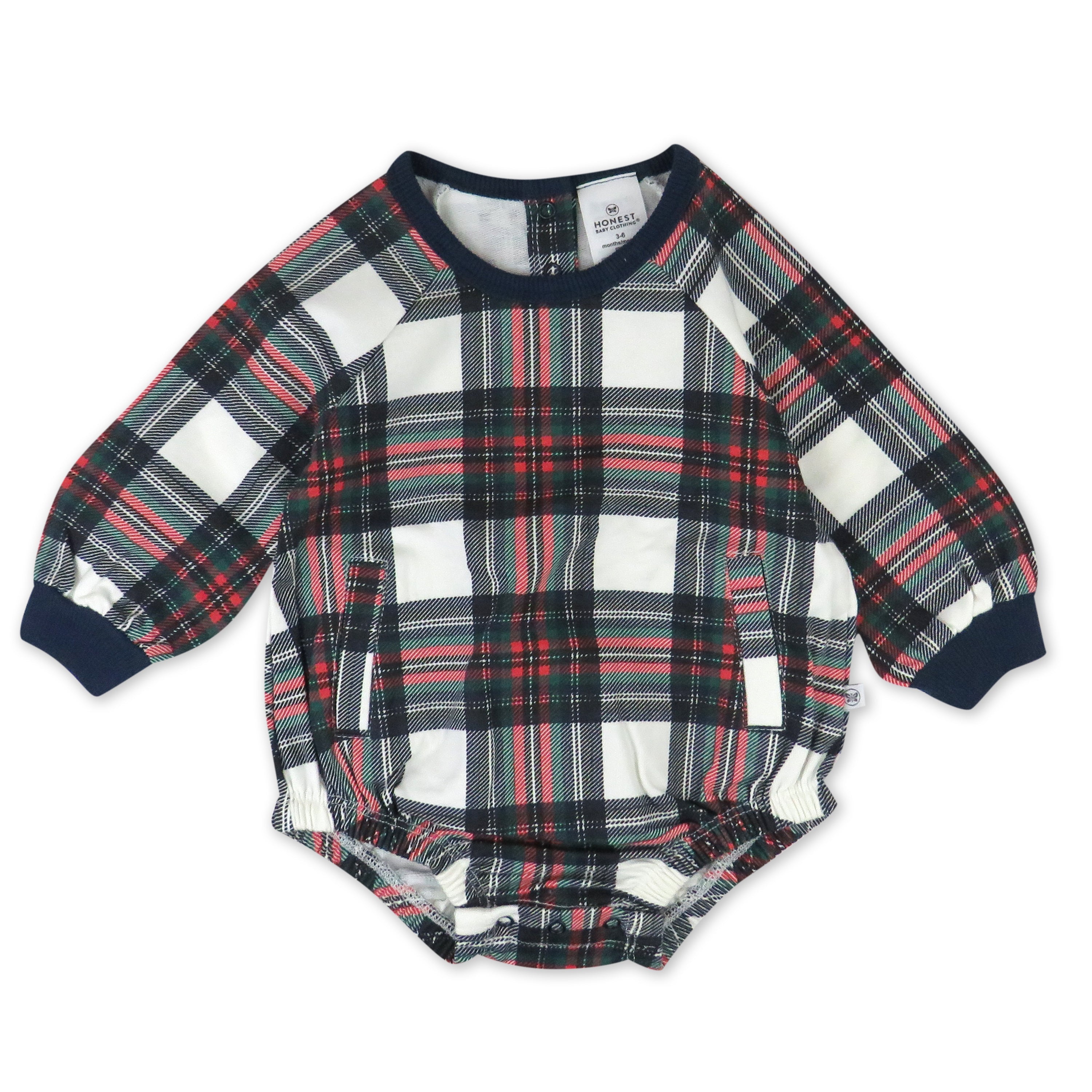 This bubble romper with long sleeves and pocket details is the cutest look for the Holidays. This stylish one-piece outfit is comfy and cozy for baby and easy for parents. Responsibly made from machine washable 100% certified organic cotton, this romper features nickel free snaps on the back and the bottom for easy dressing and quick changes. Available in adorable prints and colors, you'll want more than one. Makes a great baby gift too!