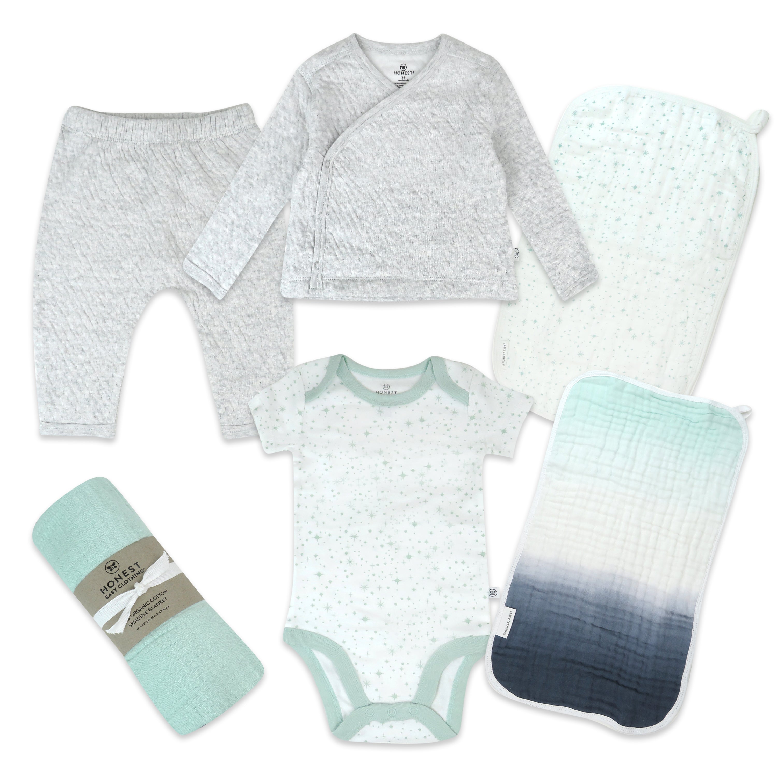 This adorable 6-Piece Take Me Home gift set has the baby essentials you need to welcome a new little one. This beautiful gift includes a comfy bodysuit and a matelasse side-snap top with harem style pants. Two soft burp cloths are just right for when things get a little messy. Add a dip-dyed swaddle blanket for extra snuggles. Crafted from 100% organic cotton, certified by GOTS. This gift set is beautifully packed in a craft gift box with a ribbon. Gift-giving made easy!
