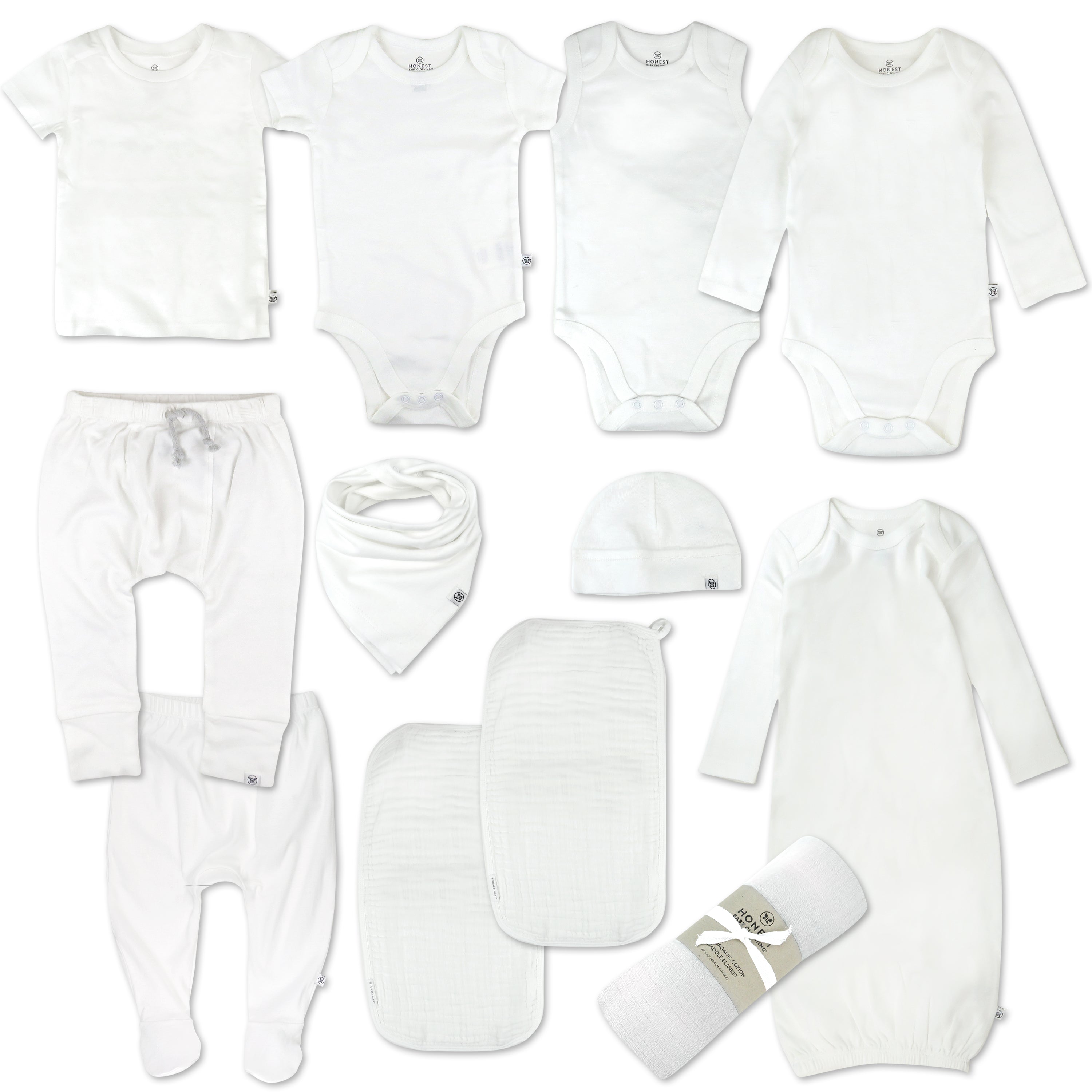 • 12-piece gift set includes: Sleeper Gown, Sleeveless Bodysuit, Short Sleeve Bodysuit, Long Sleeve Bodysuit, Short Sleeve T-Shirt, Footed Pant, Honest Pant, Beanie, Bandana Bib, Swaddle Blanket and 2 Woven Burp Cloths